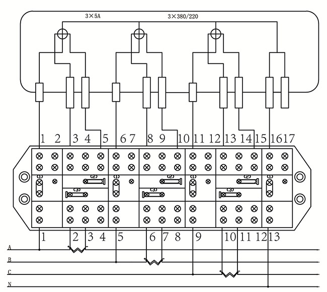 電度表接線盒除N線帶熔斷器系列,A相、B相、C相均采用聯接片聯接,一般用在額定電壓3×380V(一般二線或四線)有功電度表上。